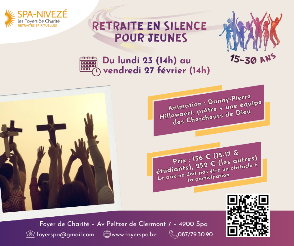 Pour les jeunes de 15 à 30 ans le Foyer de Charité organise du 23 au 27 février 2025 une retraite animée par l’abbé Danny-Pierre Hillewaert. Bienvenue à tous pour une expérience inoubliable !